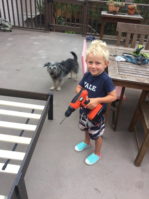 Helping to assemble his twin bed.